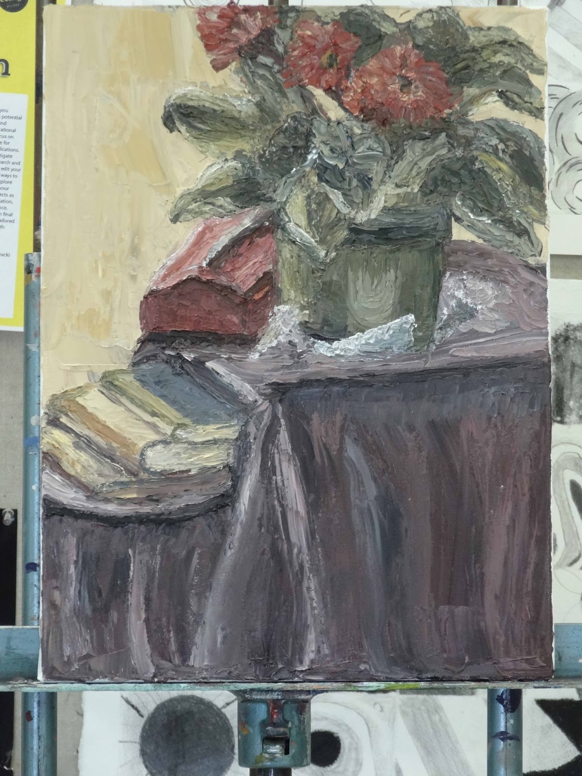 Painting #2 came due in a hurry. It is tremendously fun to watch everyone learn and grow. I enjoyed this experience. All of us did a still life, but we all stand at different easels. This is mine....